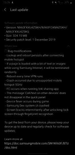 1 Aralık 2019 tarihi itibariyle Note 9 kullanıcıları için One IU 2.0 Beta 3 güncellemesi N960FXXU4ZSKH yapım numarası ile indirilmeye sunulmuş durumda.